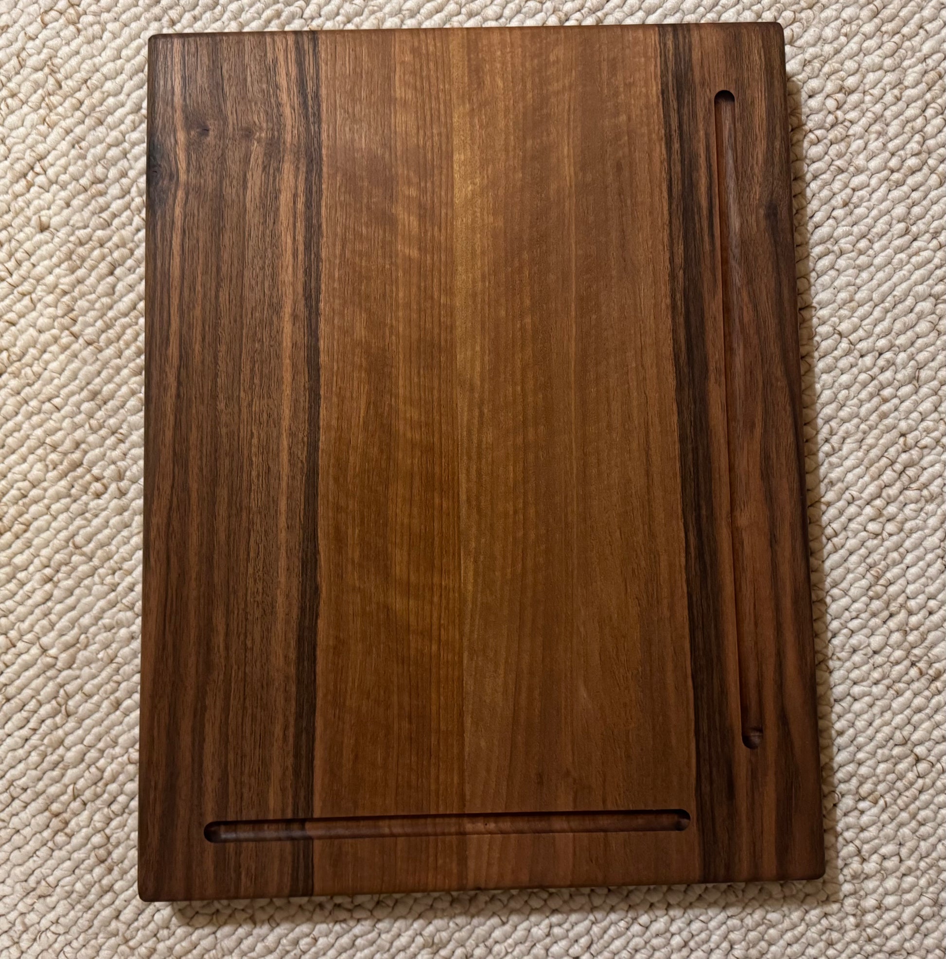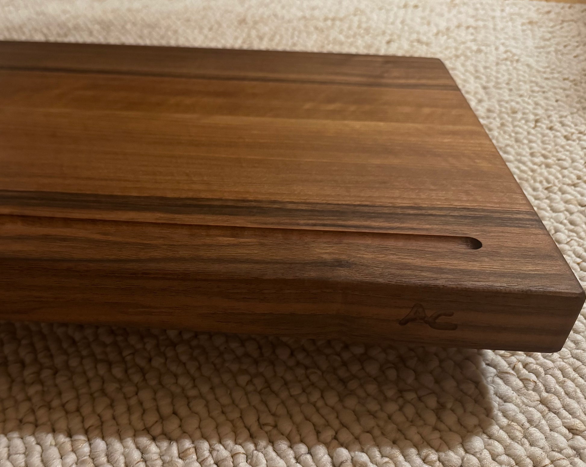 La planche est dotée de deux rigoles, une plus longue sur l’un des bords et une plus courte sur le côté, permettant de récupérer les jus lors de la découpe, un détail pratique pour éviter les débordements sur le plan de travail. Les bords sont nets et bien finis, reflétant un travail soigné du bois.