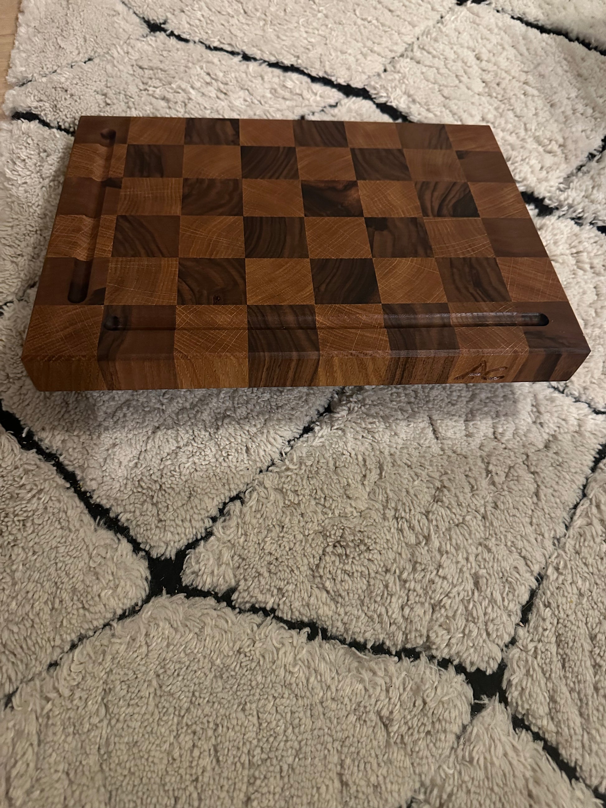 Le motif damier, obtenu par l’assemblage précis de blocs de bois soigneusement sélectionnés, fait de chaque planche une pièce unique. Le contraste des teintes, la richesse du grain et la finition impeccable en font un véritable objet décoratif autant qu’un outil professionnel.